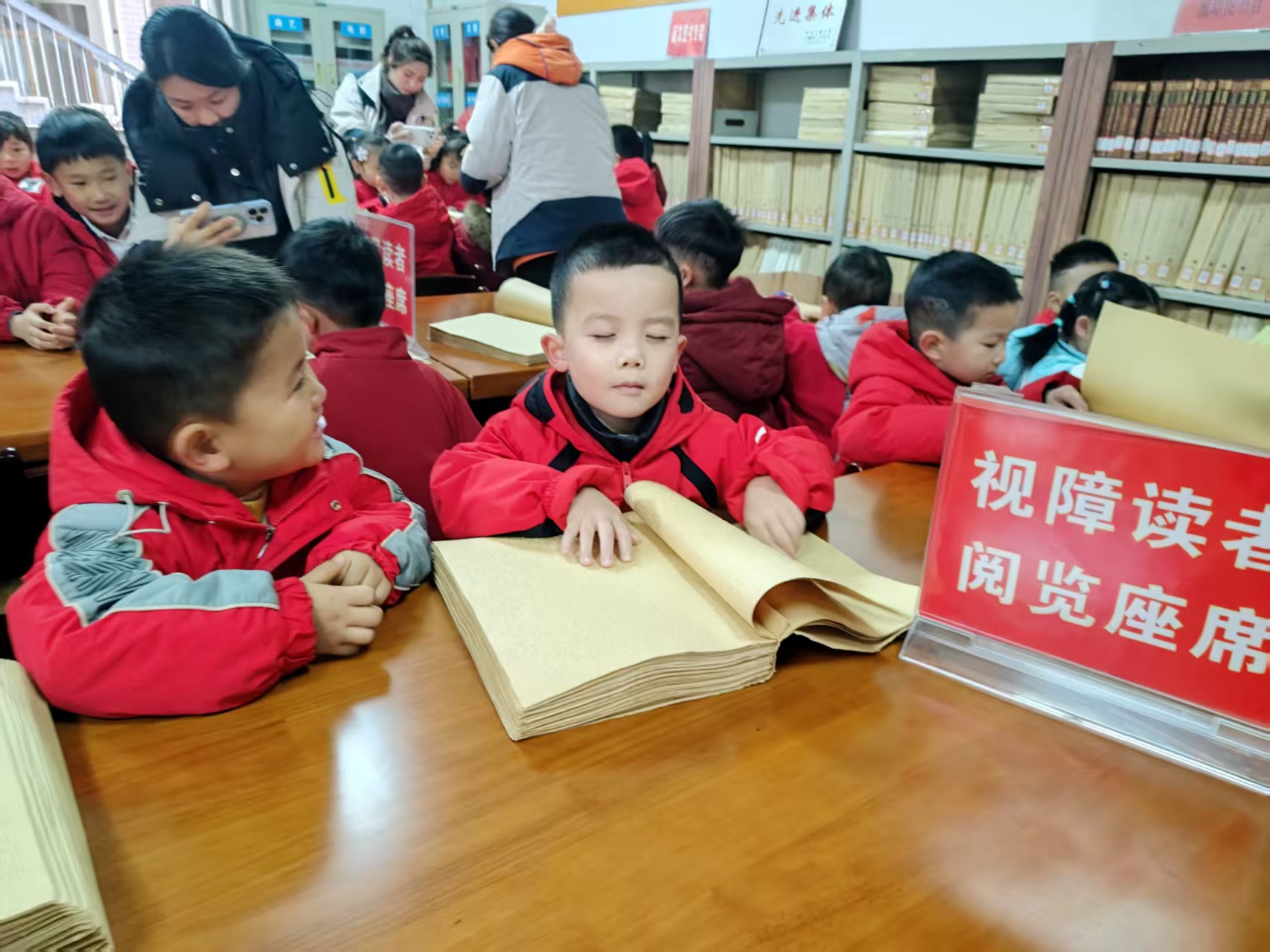 活动伊始,孩子们在图书馆工作人员的带领下开启探索之旅。在道德模范风采展展区,通过观赏图片、聆听讲解、观看实物陈列,孩子们了解到十堰本地道德模范的先进事迹,感恩情怀在潜移默化中萌芽;走进电子阅览室,盲文读物成为“神奇教具”,工作人员用浅显易懂的语言讲解盲文的起源与特点,引导孩子们轻轻触摸,在指尖感知特殊文字的魅力,同理心悄然生长。