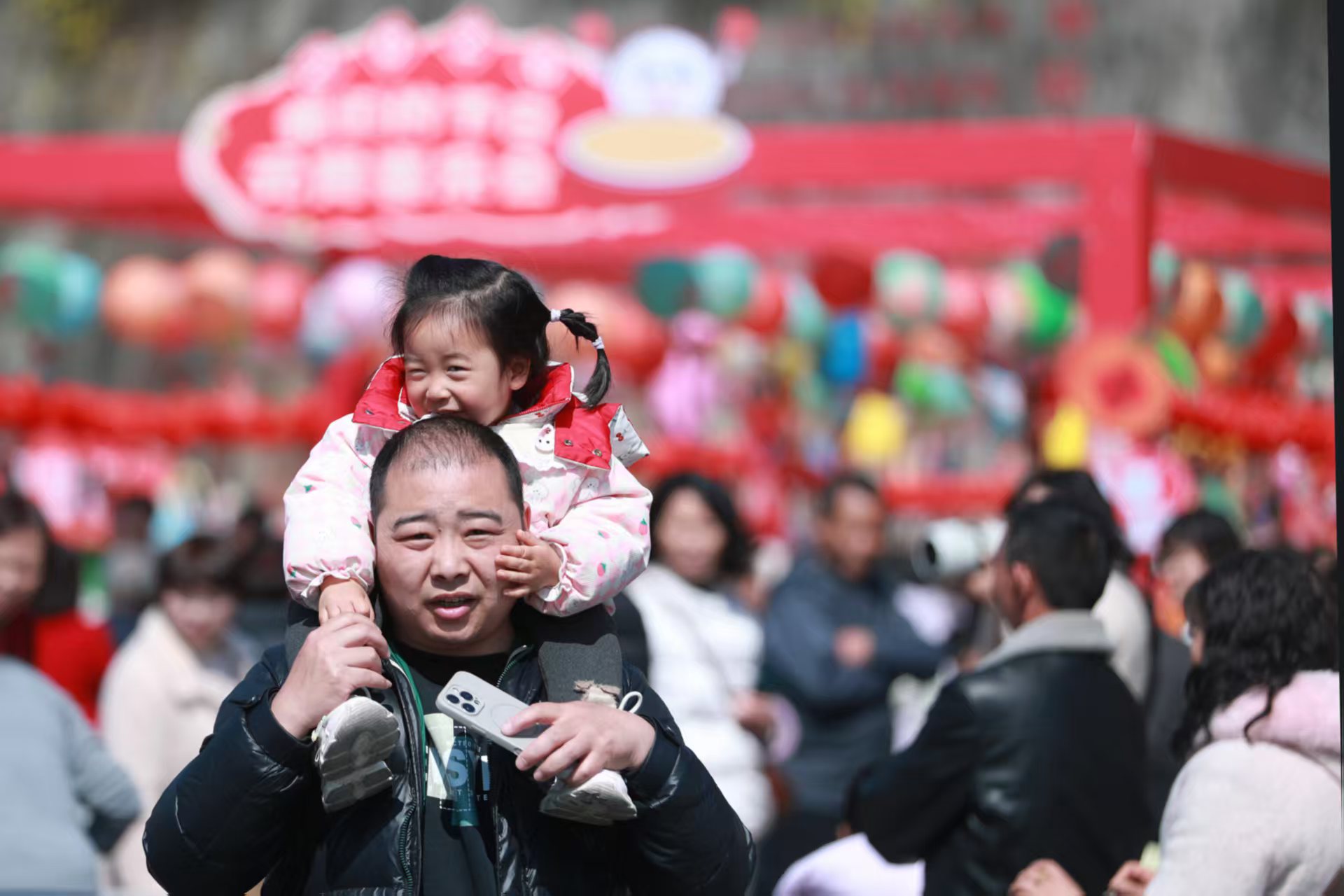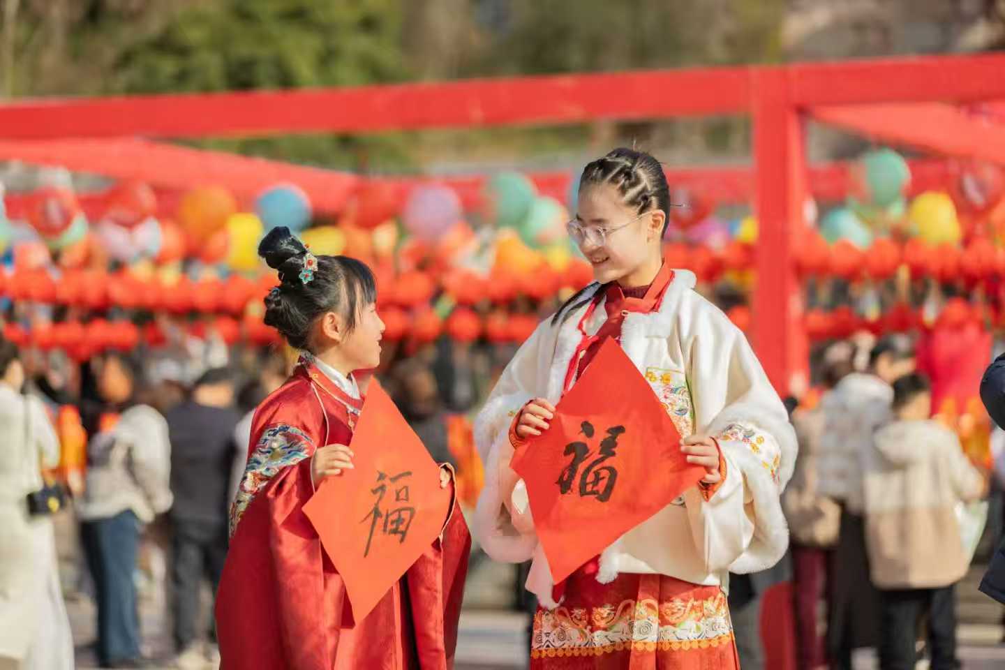 滚铁环、跳皮筋、夹“汤圆”、投壶、蹴鞠……趣味游艺区成为孩子们的天下。在“巧手夹福”游戏中,孩子们屏息凝神,用筷子将“乒乓球汤圆”从一个碗夹到另一个碗;滚铁环赛道上,不时传来铁环倒地的惋惜声和挑战成功的欢呼声;跳皮筋区,全家总动员,老少齐上阵,伴着《马兰花》童谣,默契的配合引来阵阵掌声。