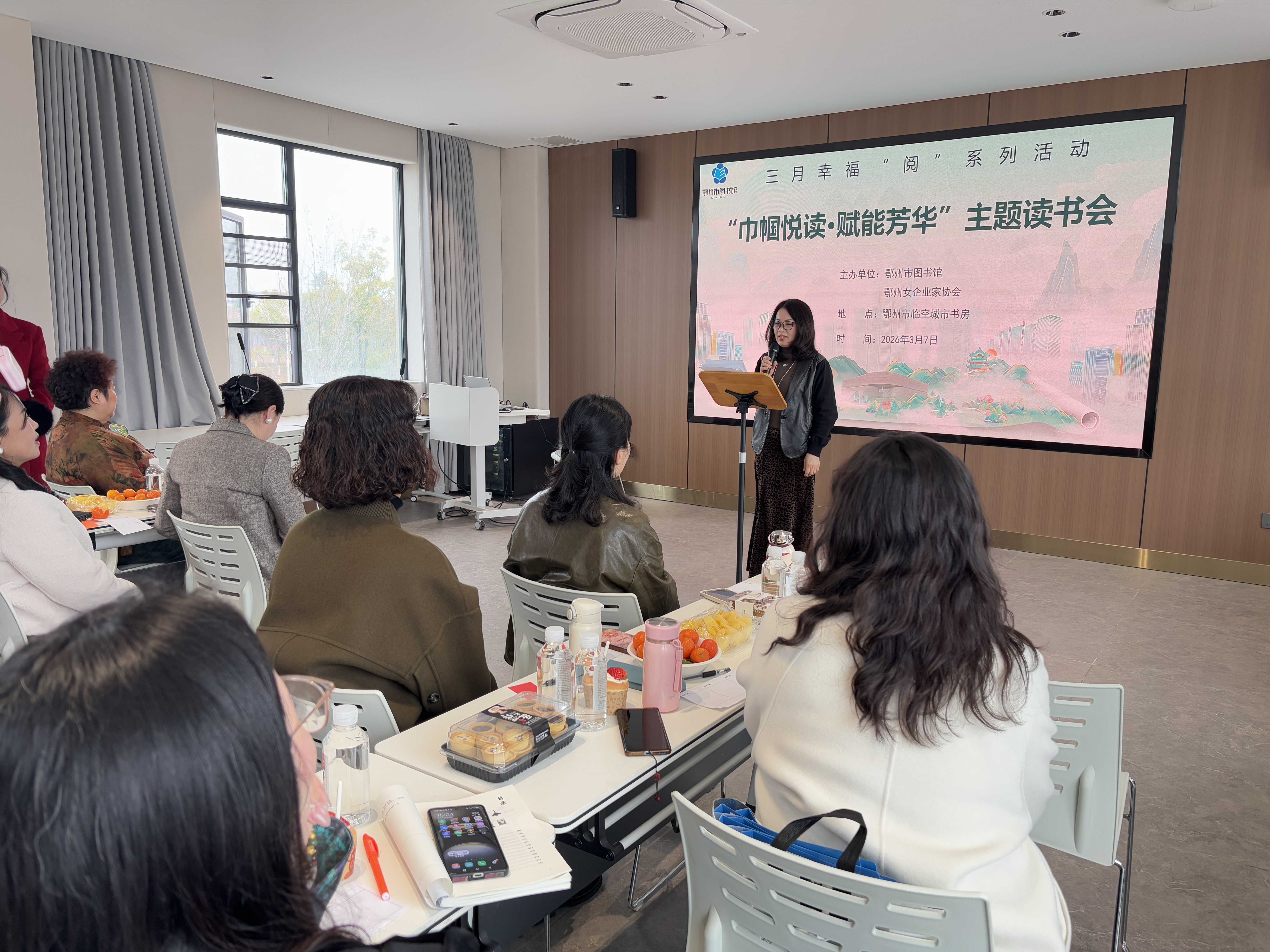 (撰稿人:朱海霞)书香氤氲三月天,巾帼齐聚绽芳华。为庆祝第116个“三八”国际妇女节,3月7日下午,鄂州市图书馆积极响应湖北省图书馆长江读书节“善用科技·马上幸福‘阅’”系列推广活动号召,联合鄂州市临空经济区新时代文明实践站、鄂州市女企业家协会,共同举办“巾帼悦读·赋能芳华”主题读书分享会。女企业家会员齐聚一堂,以书为媒,以声传情,在阅读分享中展现女性风采,汲取前行力量。