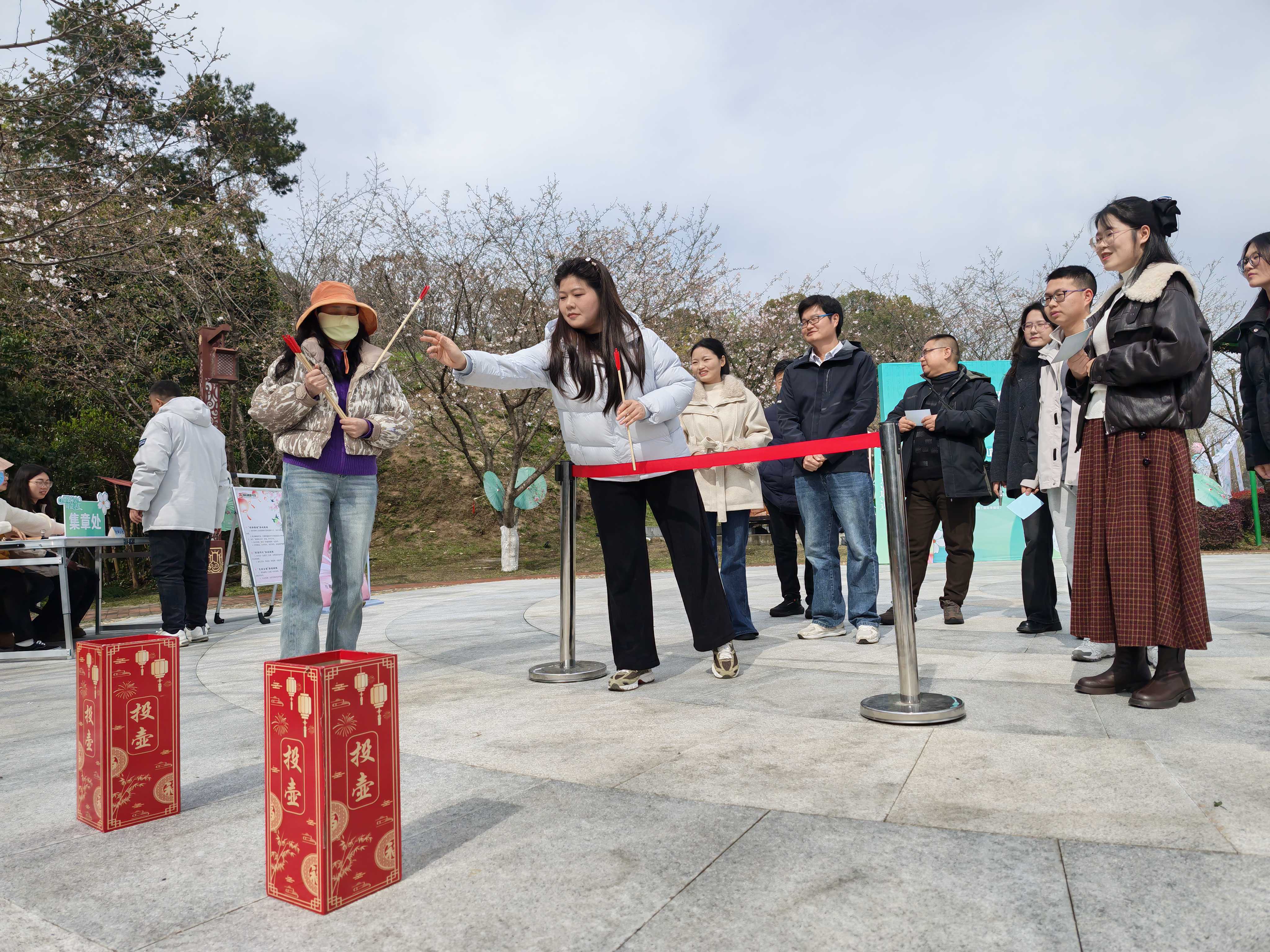 “往左边一点,投!”投壶问礼关卡前,一位女嘉宾正指挥着蒙眼的男搭档投掷箭矢。这对临时组队的“CP”此前素不相识,此刻却配合默契、笑声不断。樱花树下,垂挂的灯谜随风轻摆,青年们或仰头苦思、或蹲地比划,猜出谜底时相视一笑,思维的火花在浪漫的空气中甜蜜碰撞。