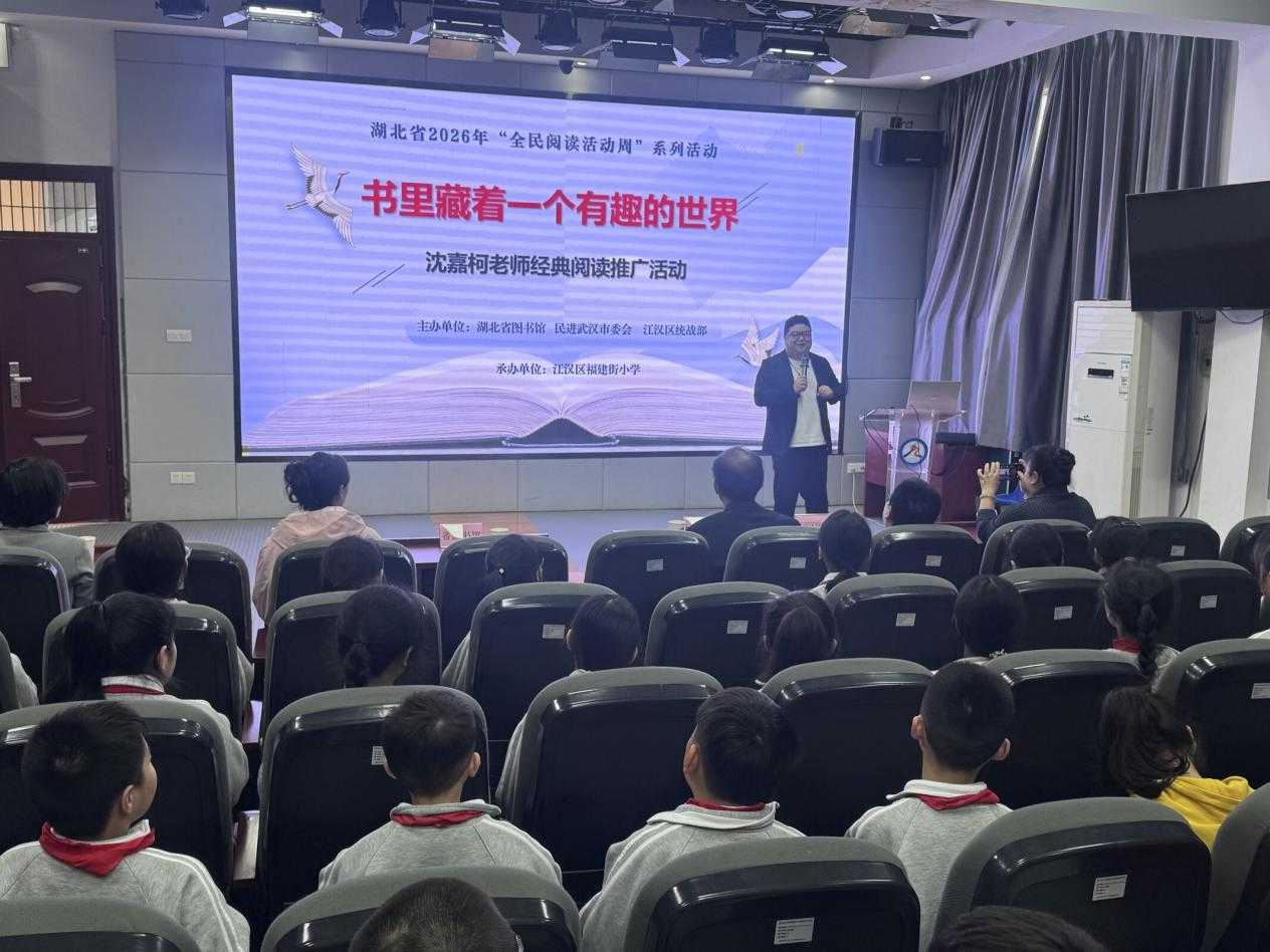 (福建街小学供稿)在2026年首个全民阅读活动周暨第31个“世界读书日”来临之际,为引导学生爱上阅读、学会阅读,深耕书香校园文化,推进学校语言素养提升行动,由湖北省图书馆、民进武汉市委会、江汉区统战部主办,江汉区福建街小学承办的“书里藏着一个有趣的世界--沈嘉柯老师经典阅读推广活动”在学校顺利开展。知名作家、学者沈嘉柯先生走进校园,以书为媒,与学生对话,带来了一场生动鲜活、意蕴悠长的读书交流盛宴。